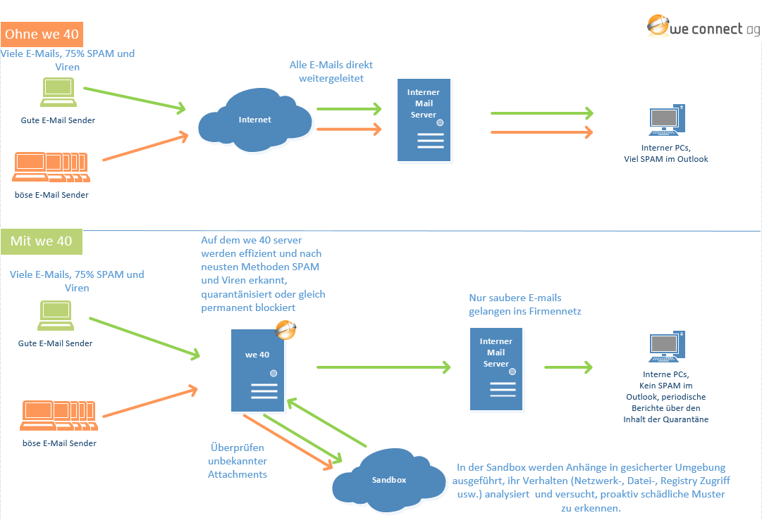 Email Sicherheit ist mehr als nur das Filtern von unerwünschten „Werbe“-Mails. Es beinhaltet Virenschutz, Missbrauch des Mail Server in einem Bot-Netz, Phishing und Malware … Mit we 40 cloud bieten wir eine verwaltete Cloud Lösung in lokalen Datencenter neuster Technologie auf Basis von Fortimail. Dabei werden alle Ihre Email auf Spam und Viren geprüft – sie bekommen nur noch geprüfte Email in ihr Netzwerk. we 40 die Alternativ als dedizierte Lösungen nur für Ihr Netzwerk. FortiMail Datasheet PDF Wie funktioniert we 40?